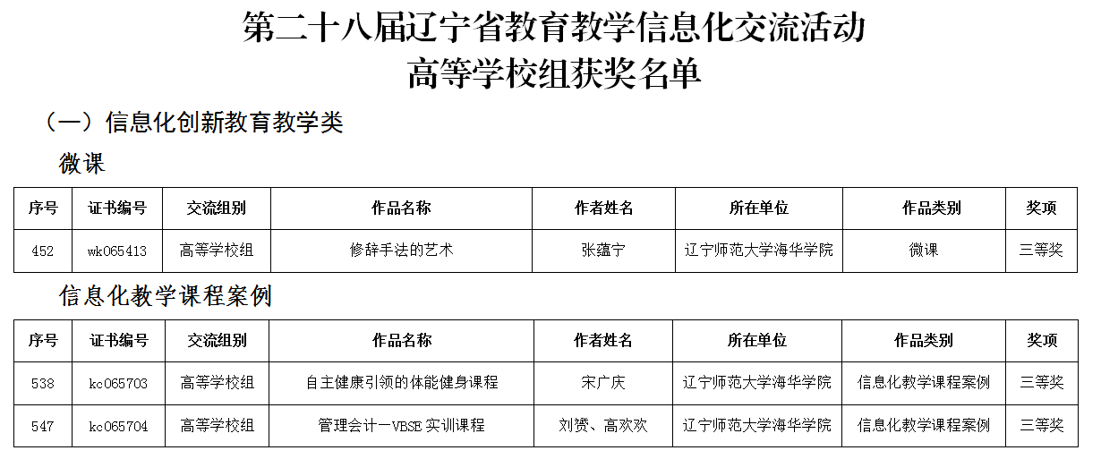 近日,在第二十八届辽宁省教育教学信息化交流活动中,我校外国语学院、体育教育学院、管理学院教师团队申报的3件作品分别荣获了高校组微课、信息化教学课程案例类别三等奖。